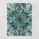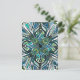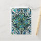 An abstract mandala hand drawn with pen and ink in a striking starburst and flower pattern. Colored with pencil in hues of blue and green.