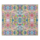 A vibrant symmetrical pattern showcases a kaleidoscope of colors including pink, blue, green, and yellow. The intricate design is set against a muted gray background, creating a striking contrast.