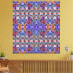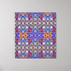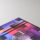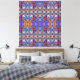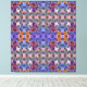 A complex, geometric pattern features vibrant hues of purple, blue, orange, and pink, set against a gray background. The design creates a symmetrical, visually dynamic effect.
