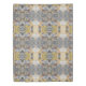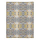 A symmetrical pattern features a blend of colors including gray, yellow, and orange, creating a kaleidoscopic effect. The repeating design gives a sense of complexity and movement.