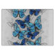 Vertical composition of realistic, blue and white morpho butterflies on gray textured background. Morpho blue butterfly.