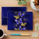 Composition of luxurious sapphire and gold jewelry butterflies on blue textured background.