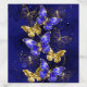 Composition of luxurious sapphire and gold jewelry butterflies on blue textured background.