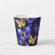 Composition of luxurious sapphire and gold jewelry butterflies on blue textured background.