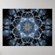 Computer fractal illustration of gray blue winter snowflake pattern on black background