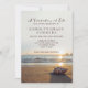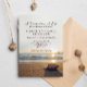Elegant memorial service invitation, featuring a conch lying on a beach at sunrise. The back has a marble background. A celebration of life invitation with a tranquil photo of the ocean and a conch resting on the beach with the sun just rising. Ocean-themed memorial service invitation without a photo, with brown fonts against a photo of the sea at sunrise with a conch in the foreground.