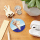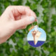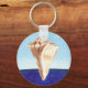 Painting of a beautiful conch sea shell against the blue ocean and sky, is printed on key chains.