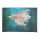 A delicately pink tinted conch shell so realistic you can almost hear the ocean, on a vibrant ocean blue background.