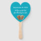 Heart-shaped wedding fan with conch shells design. Aqua blue color, this handheld fan has an ocean background on the front with names of the couple in swirling script font. On the other side, include the date of event along with a wedding saying. The sample wording is, "To have and to hold from this day forward". This design and wording will work on other shapes, but not the rectangular. Keep all text away from edges. The design will print as you see it!