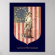 Vintage looking drawing of Concord Minuteman with 13 colonies (Betsy Ross) first American flag in the background on shield shape. Distressed. You can add your message