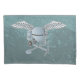 Concrete mixer blue-gray with wings, pickaxe and shovel.
