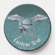 Concrete mixer blue-gray with wings, pickaxe and shovel. Grunge blue - gray background. Custom text.