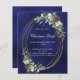 A navy blue, uneven colored background decorated with cones, white berries and greenry. A faux gold oval frame. Personalize and add the details.