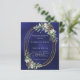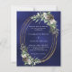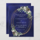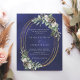 For a winter wedding. A navy blue, uneven colored background decorated with cones, white berries and greenry. A faux gold oval frame. Personalize and add your names and details.