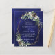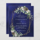 For a winter wedding. A navy blue, uneven colored background decorated with cones, white berries and greenry. A faux gold geometric frame. Personalize and add your names and details.