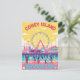 Bright, retro illustration of Coney Island, Brooklyn, featuring a large Ferris wheel and a vibrant boardwalk scene with people looking out over the water.