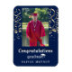 Gold Confetti Congratulations Graduation Photo Magnet. Trendy white script on a navy blue background with golden confetti. Add your favorite photo and personalize it with your grad’s name.