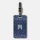 Chic monogrammed luggage tag in timeless navy blue and white features white confetti raining from the top and bottom, with your single initial monogram in the center in white modern calligraphy script lettering. Customize the back with your full contact details in modern white lettering on a matching navy background.