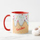 Here's a fun mug that makes a great birthday present when filled with the recipient's favorite candy! The pattern is a waffle cone background with white icing. The icing is filled with colorful confetti dots. One side has a custom name in red.