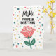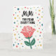 This greeting card features a white background with the name “MiMi” placed near the top in a flowing, cursive-style look, setting a tender tone ❤️. Just beneath it, the phrase “YOU MEAN EVERYTHING” appears in clear, all-capital letters, standing out as the main message in a darker ink. Below the words, a single rose blooms in soft coral-pink with light edging that helps the petals stand apart. A deep green stem and a few green leaves ground the flower, giving it a calm, steady base that feels like a quiet gesture of care. Scattered around the text and rose are small round confetti dots, as if someone sprinkled a little celebration over the page 🌼. The dots vary in size and show teal, golden yellow, soft red, and bright green, creating gentle movement without crowding the design. The confetti clusters lightly around the center, leaving plenty of open white space so the rose and lettering stay easy to notice. The coral-pink rose sits centered under the message, with teal and yellow dots floating nearby on the white field.