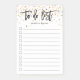 Chic personalized note pad in crisp black and white features "to do list" at the top in handwritten style brush lettered typography, with a top border of gold, blush rose, and black confetti dots. Personalize with your name or choice of text beneath, or leave blank if desired. 11 lines with checkboxes help you keep track of all your important tasks!