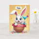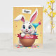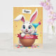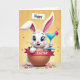 This card shows a friendly, human-like white rabbit popping up from the cracked top of a shiny brown egg-shaped container, with pink inner ears, rosy cheeks, and bright blue eyes that seem to sparkle as it smiles at you 🐰. Behind it, a soft yellow-to-orange gradient background glows with faint patterning, like warm light spreading across the scene. Confetti pieces in pink and purple swirl around the rabbit, adding motion and a party feel. The rabbit lifts a slender glass filled with shimmering blue liquid, topped with a small pink round garnish, as if raising a toast to someone close 🐇. A wide red banner wraps around the base of the egg shape, carrying the main message in lighter-colored lettering, while a smaller banner floats above with extra text in a matching style. In the foreground, scattered round candy-like discs in bright colors sit across a pale, lightly textured surface, like treats left out for two friends to share. The cracked shell edge is jagged and glossy, framing the rabbit’s head and ears against the warm backdrop.