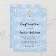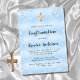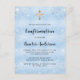 For a confirmation, celebrating a boy. A blue faux metallic looking background. Decorated with blue faux glitter dust. Personalize and add the name and details. The name and confirmation are written with a hand lettered style script