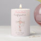 Elegant confirmation pillar candle for girls with a floral cross, a blush pink backdrop and a hand lettered name. Personalize with name, text and date.
