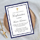 A modern, elegant and confirmation invitation. A white background decorated with royal blue frames and a golden cross. Personalize and add a name and details. Black colored letters.