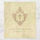 An elegant religious design with a cross in a vintage crest. The crest and the cross are brown, the background looks like parchment (old paper). Under the crest, in small caps, there are the name and occasion and under them the date, all in brown letters.