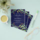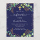 A navy blue background decorated with eucalyptus greenery and golden leaves and faux gold glitter sparkles. A golden cross. Personalize and the child's name and ceremony details.