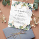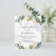 Marble print as background decorated with eucalyptus greenery and golden leaves. A golden cross. Personalize and a name and ceremony details.