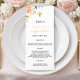 Confirmation reception menu card. Personalize and add a name, date and the menu. A chic white background. Decorated with a watercolored rose gold and blush pink rose and green eucalyptus leaves, sprigs, greenery, faux gold leaves. A faux gold cross.