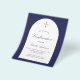 A navy background and a white arch frame. Personalize and a name and ceremony details. Elegant hand lettered style script.