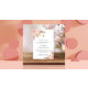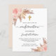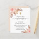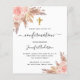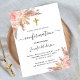 A chic white background. Decorated with rose gold and blush pink florals, roses, pampas grass and a golden cross. Personalize and add a name and details.