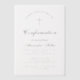 This minimalist, black and white transparent confirmation invitation has just simple text on transparent background. The occasion and the name are written in an elegant calligraphy. In the upper part there is a simple cross, with arched text above it. The cross and the text are black, the background is transparent white.
