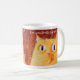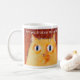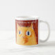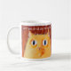A cartoon painted cat with white circular eyes. Painted loosely in oranges and yellows on a red background as a closeup bust, the cat face is prominent. Above the cat is the text, "Are you drinking my coffee?".