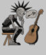 A robot with spiky hair and a confused expression sits on a stool, pondering where the plugin connects on an acoustic guitar. The thought bubble above its head contains a guitar plug and question marks, indicating contemplation and confusion.