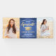 Add a personalized touch to college or high school graduation party decorations with this custom photo blue, gold and white banner. Design features a royal blue faux metallic brushed stainless steel background, gold foil look mortar board, stylish modern typography, handwritten style script calligraphy, and two photos of the graduate, such as senior pictures or images from the commencement ceremony. Please note that gold is printed color, not metallic foil. This party sign is an elegant way to celebrate the special day. Congratulations to the graduate!