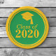 Decorate your grad's party with these school color Congrats Class of 2024 Green Gold Plates. Personalize with your graduate's class year. It features green and gold school colors and classical font. Congrats! is arched over a grad cap and the class year.