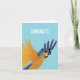 This greeting card is designed for someone celebrating an achievement or milestone. It features a vibrant blue and yellow macaw in mid-flight, with its wings spread wide. The word "CONGRATS" is prominently displayed at the top in white, uppercase letters. The background is a simple, bright blue. The artwork evokes feelings of excitement, triumph, and tropical jubilation. The dynamic pose of the macaw suggests energy and success. This artwork falls into the categories of Celebration/Congratulatory and Tropical/Exotic Animals.