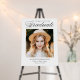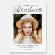Elegant graduation party sign featuring "Congrats to our Graduate" displayed in black calligraphy script with a white background. Personalize the black and white graduation sign with the graduate's senior photo, name, school name, and graduation year. The simple photo graduation sign is perfect for celebrating both high school and college graduates!