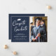 Modern dark blue photo graduation announcement card featuring the graduate's photo and "Congrats Graduate" in a modern white script with a grad cap on top. Easily personalize with their name, high school, college or university, class year and major or honors.
