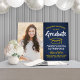 Add a personalized touch to a college or high school graduation celebration with a custom photo navy blue, gold and white 18"x24" foam board sign. Picture and all text are simple to customize. Design features a dark blue ombre background, yellow mortar board cap, modern typography, stylish script calligraphy, and one photo of the graduate, such as a senior picture or image from the commencement ceremony. Please note that gold is printed yellow color, not foil. This graduation party sign is an elegant way to celebrate the special day. Congratulations to the graduate!