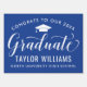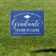 Elegant graduation yard sign congratulates and announces your grad in style! Features white grad cap, "Graduate" in script, and modern custom text that can be personalized with the graduate's name and school. Royal blue background color can be customized.