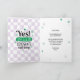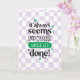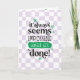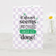 Greeting card to congratulate someone who graduated with the quote: 'It always seems impossible until it's done!'. With playful fonts, groovy retro style flowers and a checker purple background.