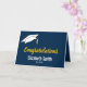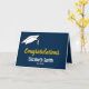 This blue and maize graduation card has a white graduate's cap in the upper left corner. Display text says 'Congratulations' in a maize script. On the front, you can customize the card with the graduate's name in white text. You can even add the year the student is graduating under the name. Inside the card, there's a message and a place to add the graduate's name and the sender's name. The blue is HEX #00274C. Maize is HEX #FFCB05.