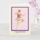 This card offering congratulations for a dance recital performance features a young ballerina in a pink and white costume. She is wearing white gloves and a white ribbon is in her hair. The background of the image is a light pink.