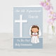 Congratulate your cousin on her First Holy Communion with an adorable girl dressed in a white gown with a flower veil, pink buttons and a pink belt. Background is blue with a white cross with light blue shading and white text.