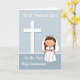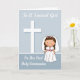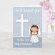 Congratulate any girl on her First Holy Communion with an adorable girl dressed in a white gown with a flower veil, pink buttons and a pink belt. Background is blue with a white cross with light blue shading and white text.